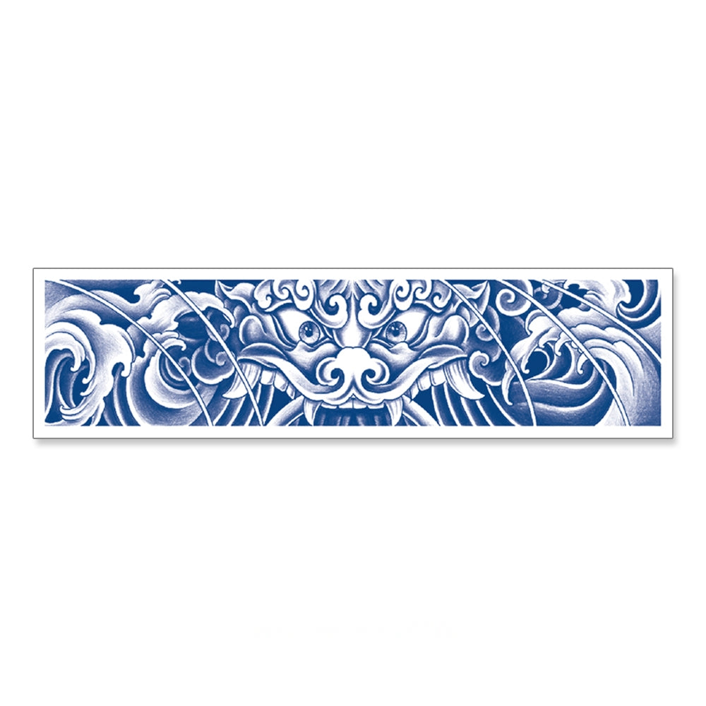 This armband tattoo depicts a fierce mythical guardian face surrounded by swirling clouds and flowing lines. It embodies power, vigilance, and protection, serving as a timeless emblem of resilience and unshakable spirit.