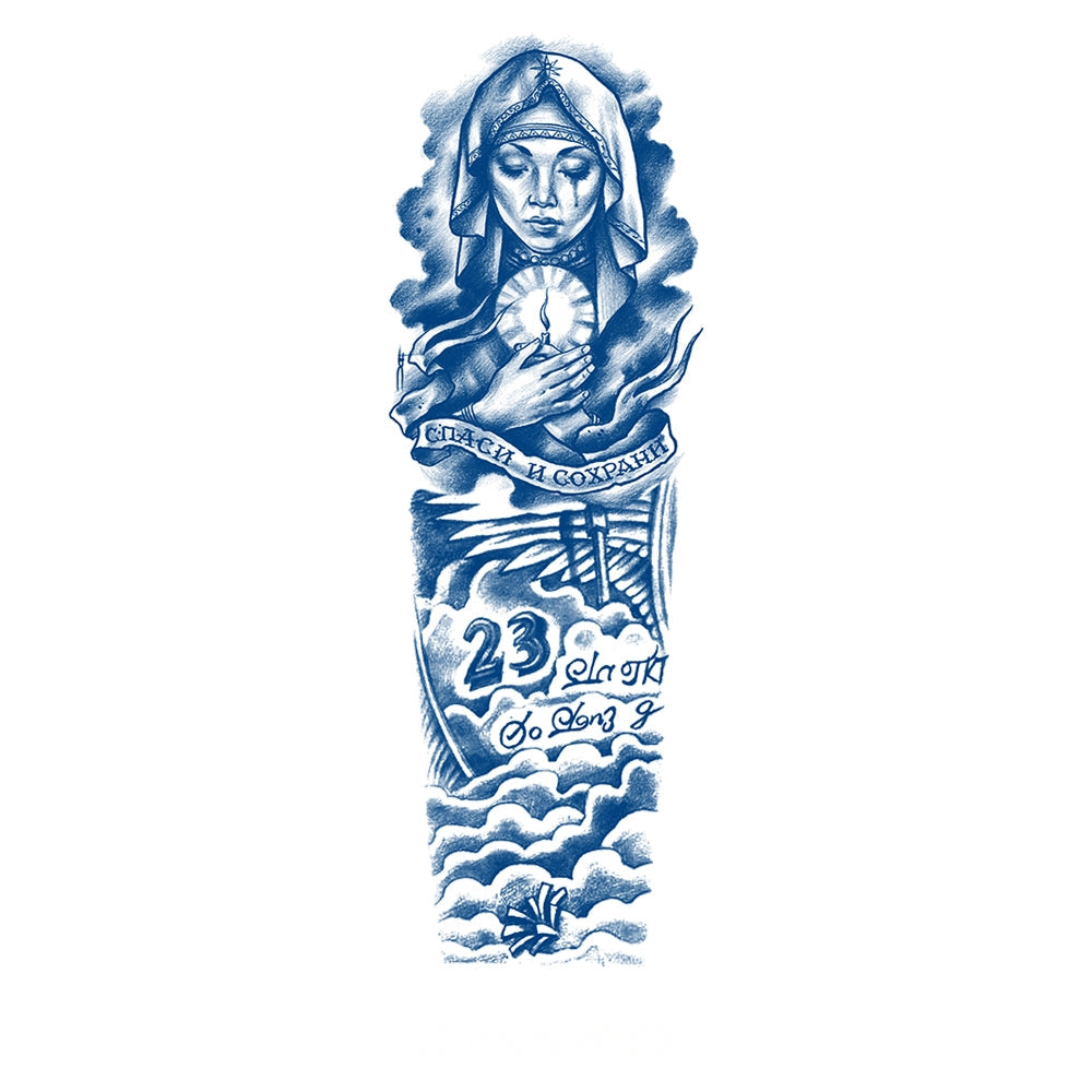 This full-sleeve tattoo portrays a serene depiction of the Virgin Mary, holding divine light close to her heart. The intricate shading and spiritual motifs represent guidance, forgiveness, and inner strength. The clouds beneath her signify transcendence, while the sacred inscriptions serve as a reminder of unwavering belief and heavenly protection.