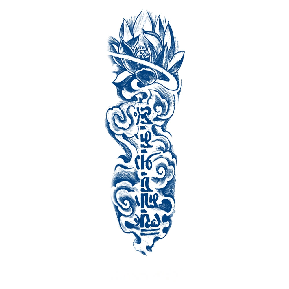 This elegant full-sleeve tattoo features a blooming lotus rising above swirling clouds, symbolizing spiritual growth and purity of heart. The sacred script running through the design embodies divine wisdom and inner harmony, making it a powerful emblem for those on a journey of self-discovery, mindfulness, and transcendence.