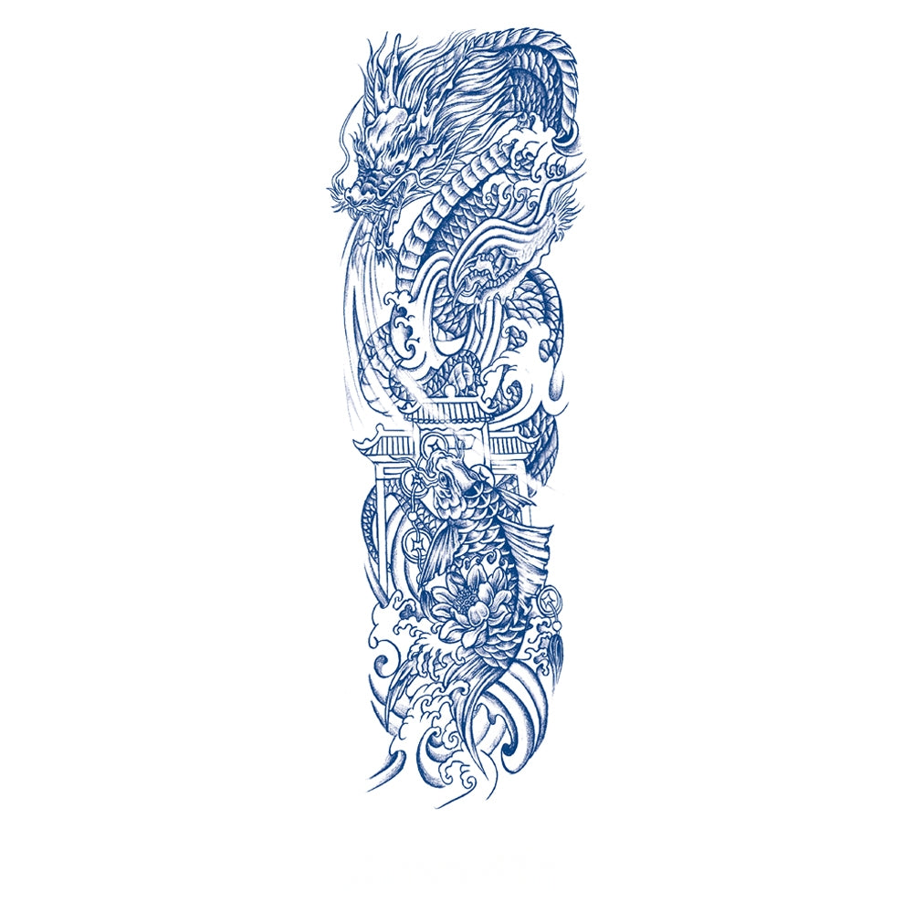 This full-sleeve tattoo features a majestic Eastern dragon descending in harmony with a koi fish, symbolizing transformation, prosperity, and strength. The dragon embodies power and divine protection, while the koi’s upward journey reflects perseverance and ultimate success. Inspired by ancient traditions, this design captures the balance between destiny and determination.
