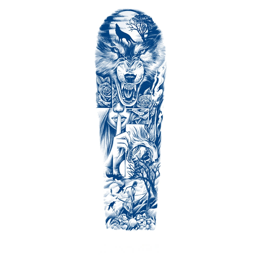 This mesmerizing full-sleeve tattoo blends realism and symbolism, featuring a fierce wolf embodying loyalty, courage, and raw power. The woman’s gesture of silence represents secrets, intuition, and inner strength, while the surrounding roses and wilderness evoke freedom and transformation. A perfect design for those who walk the fine line between chaos and control, guided by primal instinct.