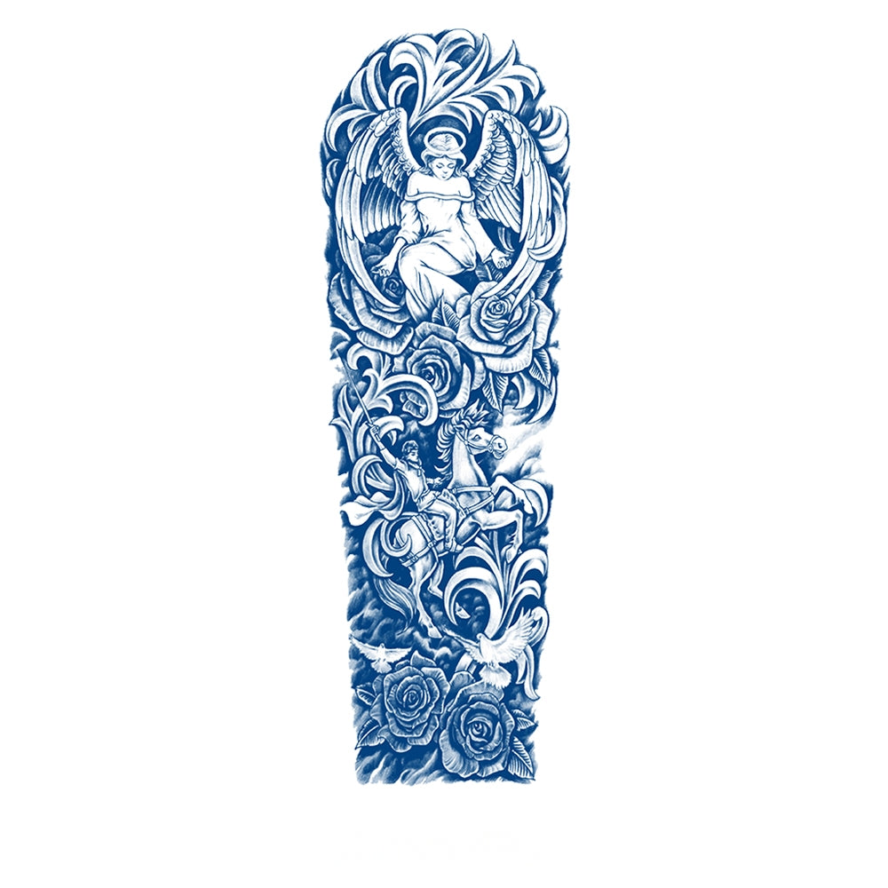 This divine full-sleeve tattoo showcases a majestic angel watching over roses, doves, and a courageous warrior on horseback. The intricate details represent purity, hope, and spiritual guidance, while the flowing patterns symbolize strength and harmony. A perfect design for those who seek protection, serenity, and unwavering inner power.