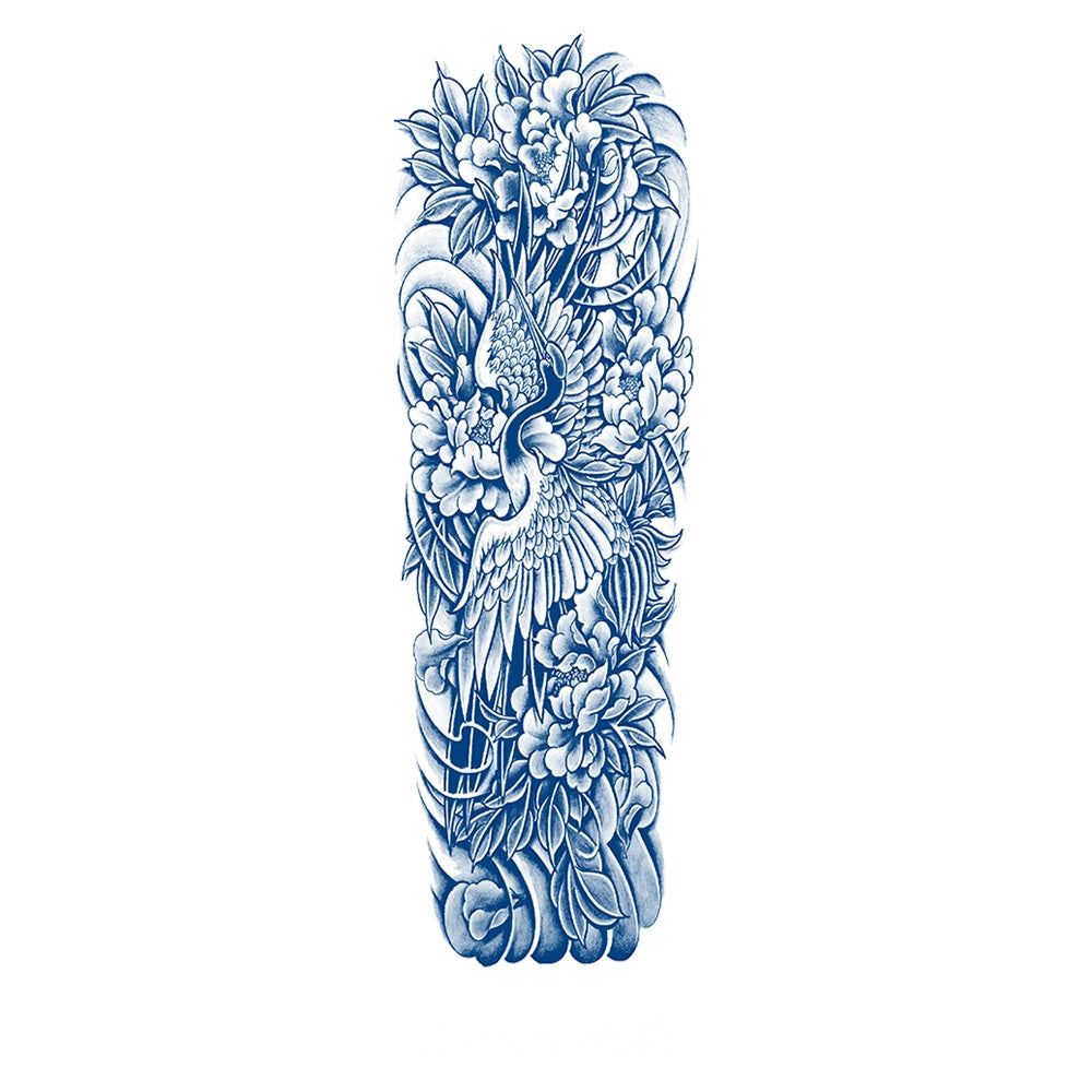 This enchanting full-sleeve tattoo features a delicate crane surrounded by lush blossoms, symbolizing longevity, peace, and personal growth. The flowing floral patterns embody elegance and vitality, while the poised bird represents freedom and spiritual awakening. A timeless design for those who cherish harmony, balance, and the ever-evolving journey of life.