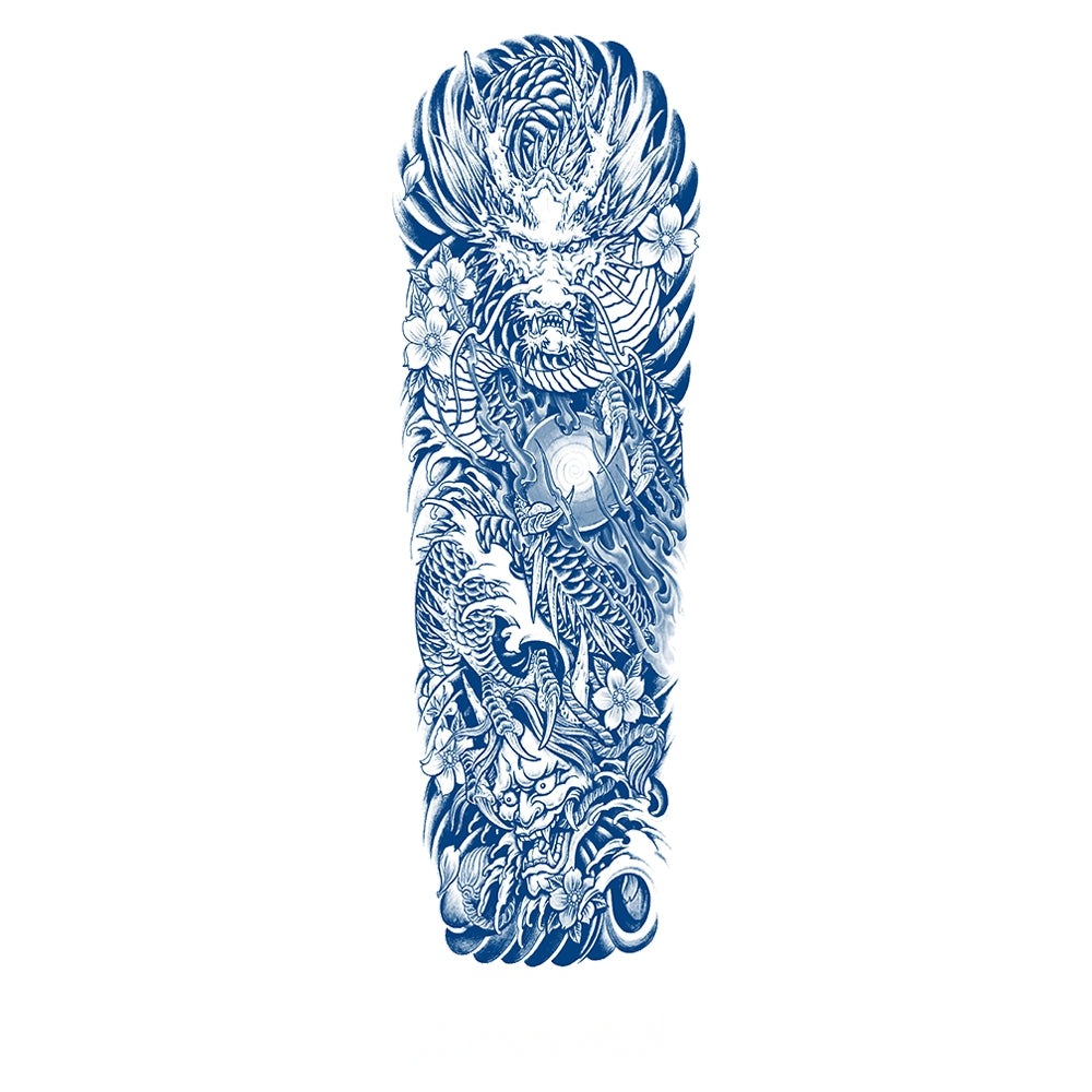 This bold full-sleeve tattoo showcases a fierce dragon clutching the sacred pearl of enlightenment, symbolizing strength, prosperity, and spiritual mastery. The intricate waves and blossoms embody harmony amid chaos, while the dragon’s fiery expression reflects resilience and dominance. A perfect piece for those destined to rise above and lead with unshakable confidence.