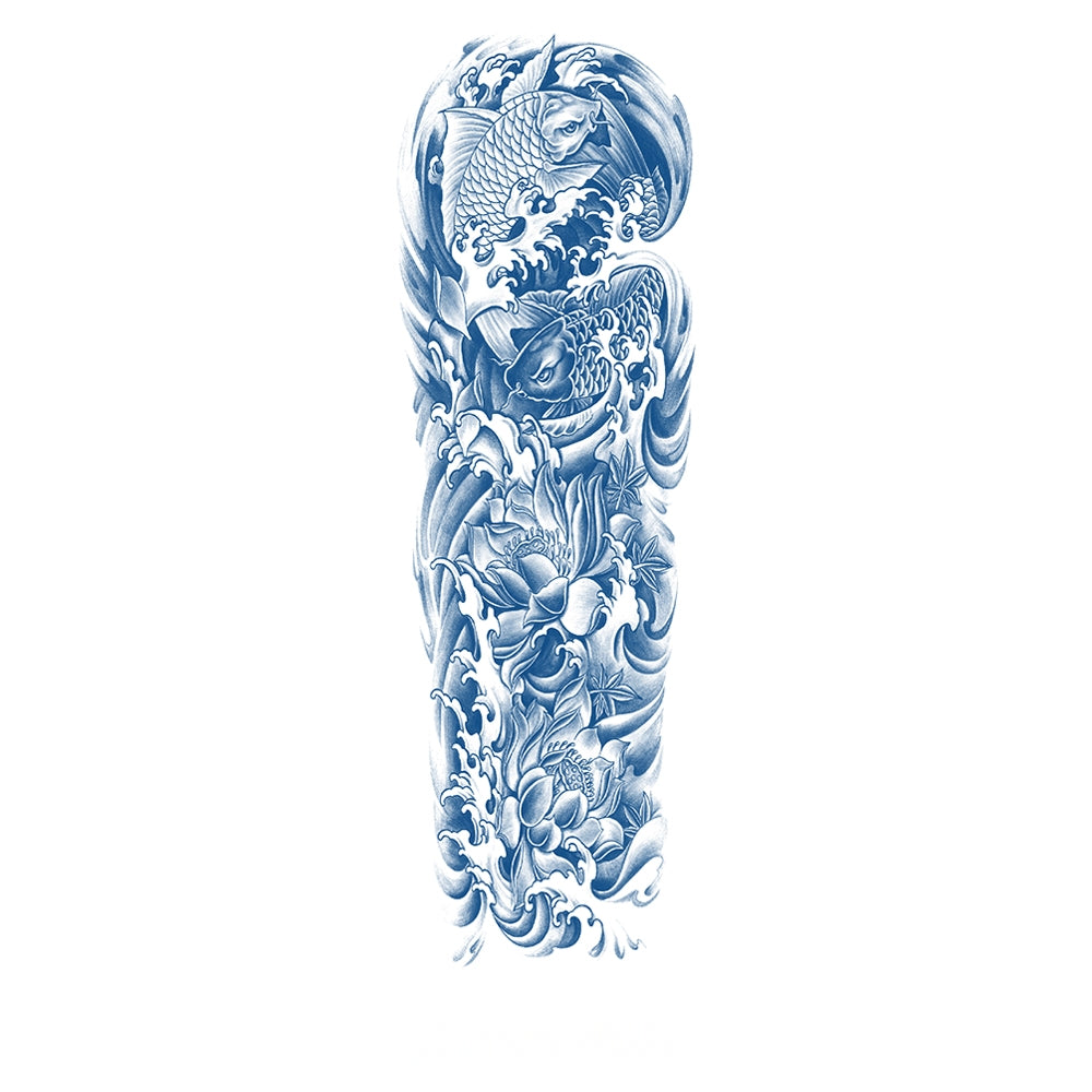 This elegant full-sleeve tattoo depicts two koi fish swimming through turbulent waves, symbolizing strength, determination, and balance. The lotus blossoms represent purity and spiritual awakening, while the dynamic water patterns embody life’s constant flow and challenges. A timeless design for those who rise above obstacles and embrace personal growth.