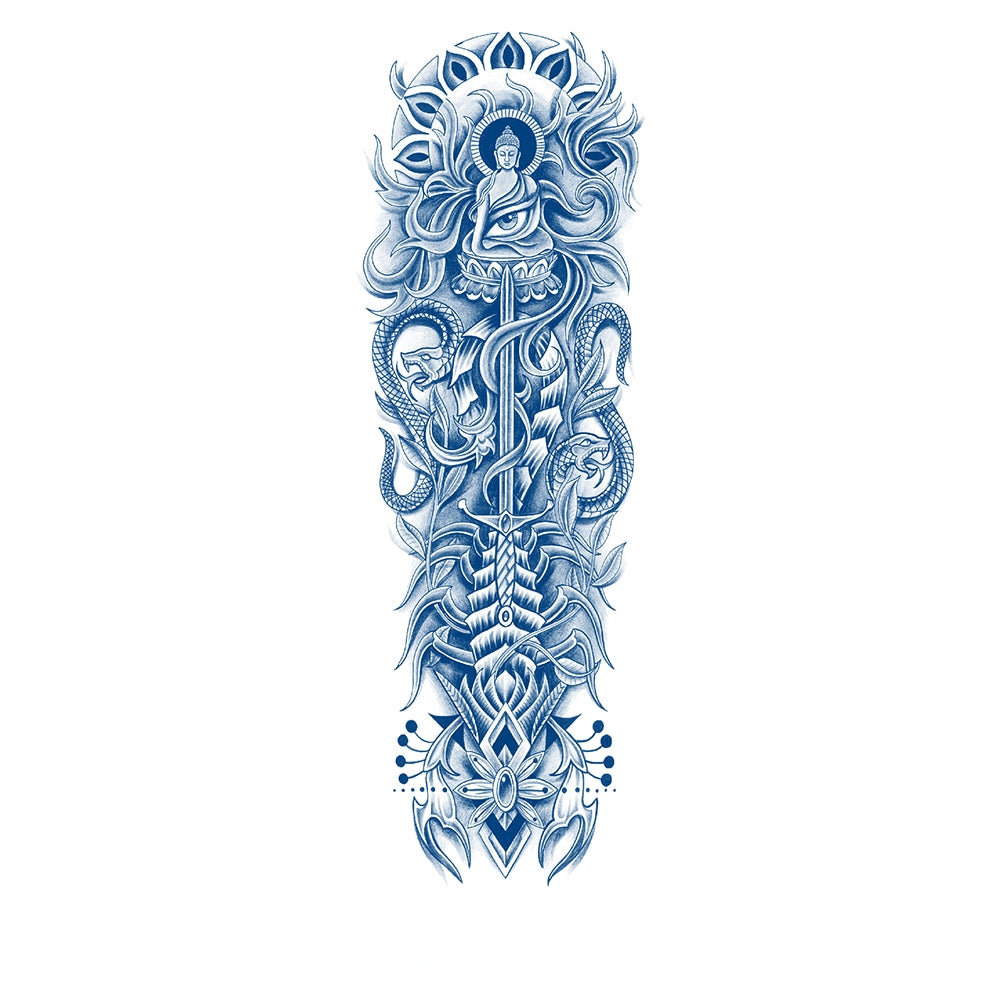 This masterful full-sleeve tattoo blends spirituality with power, featuring a serene Buddha at the top radiating enlightenment, surrounded by protective serpents symbolizing rebirth and resilience. Intricate floral elements and sacred geometric patterns flow seamlessly down, culminating in a lotus bloom that embodies purity and awakening. A bold, harmonious design for those seeking balance, protection, and transcendence.