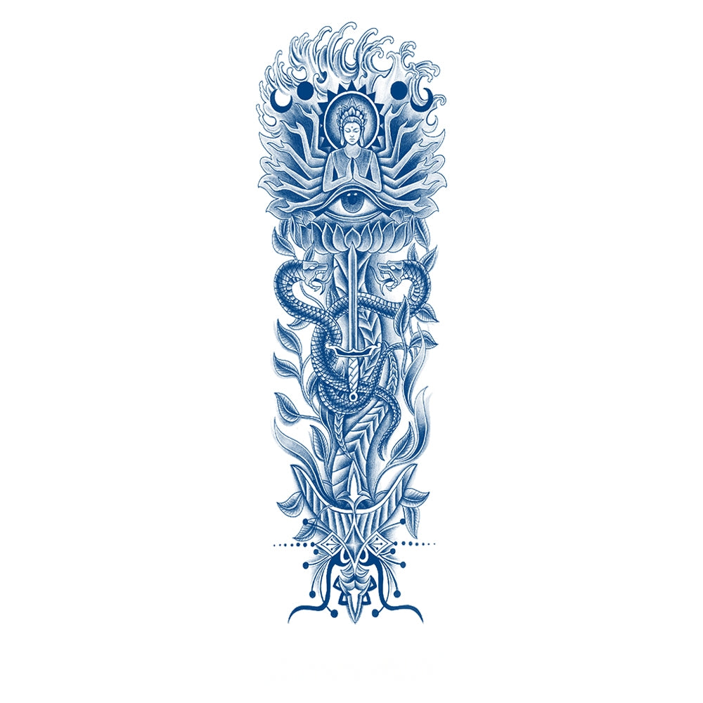 This stunning tattoo design combines divine energy with mystical strength. At the top, a meditative Buddha radiates calmness and spiritual awakening, while the all-seeing eye symbolizes clarity and higher consciousness. Two entwined serpents spiral downward, representing transformation, rebirth, and inner power. Flowing lotus petals and sacred geometric patterns complete the composition, creating a balanced, captivating sleeve design for seekers of wisdom and spiritual guardianship.