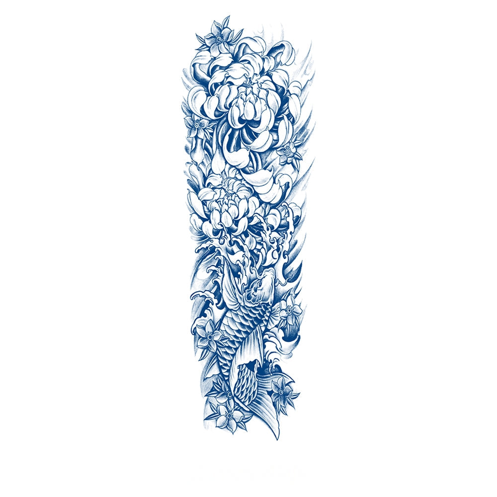 This elegant full-sleeve tattoo captures the essence of growth and determination. Flowing peony blossoms represent prosperity and grace, while the ascending koi fish symbolizes strength, ambition, and the pursuit of one's destiny. Intricate details of waves and petals create a harmonious flow, making this design a powerful statement of resilience and personal triumph.