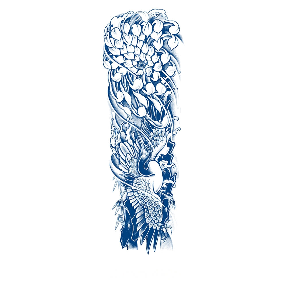 This elegant full-sleeve tattoo features a majestic crane soaring beneath blooming chrysanthemums, symbolizing prosperity, peace, and spiritual elevation. The delicate feathers and flowing petals intertwine beautifully, creating a balanced composition that reflects both strength and serenity. Perfect for those seeking wisdom, growth, and timeless elegance.