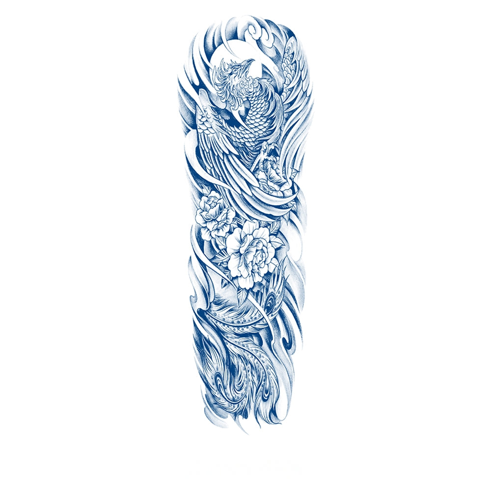 This stunning full-sleeve tattoo depicts a majestic phoenix soaring upward, symbolizing transformation, resilience, and eternal renewal. Surrounded by intricate floral patterns and flowing feathers, the design captures the essence of power, grace, and the infinite cycle of life. A perfect emblem for strength and rebirth.