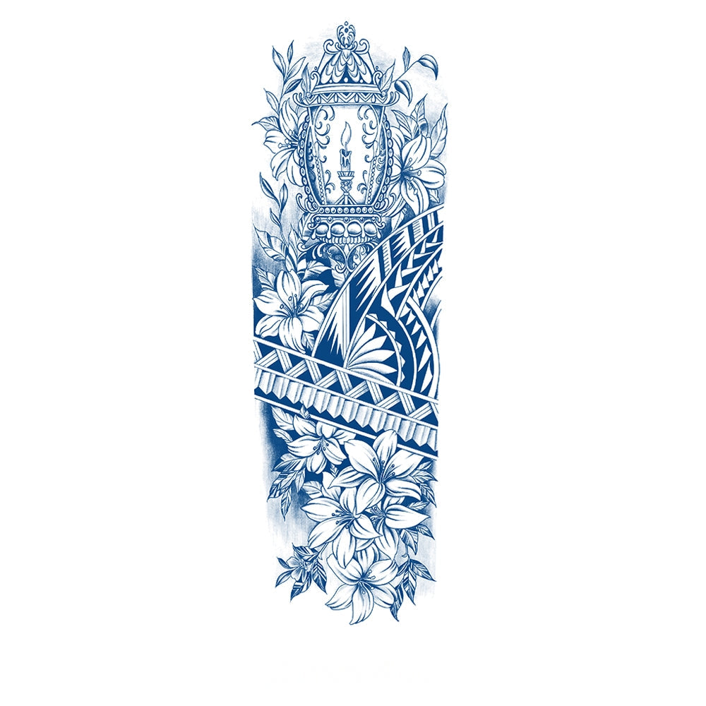 This elegant tattoo design features an ornate lantern radiating eternal light, surrounded by delicate lilies and intricate tribal patterns. It symbolizes hope, clarity, and spiritual protection, making it perfect for those who seek guidance and illumination on their life’s journey.