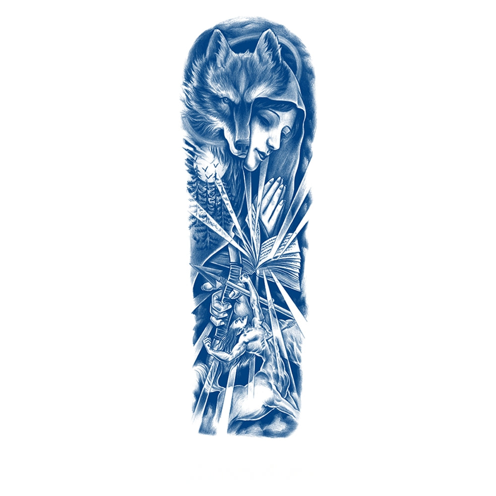 This intricate tattoo blends the wild spirit of the wolf with divine symbolism. The design features a serene figure in prayer, a powerful wolf watching over, and striking shards of light symbolizing protection, resilience, and spiritual awakening—a perfect balance between instinct and inner peace.