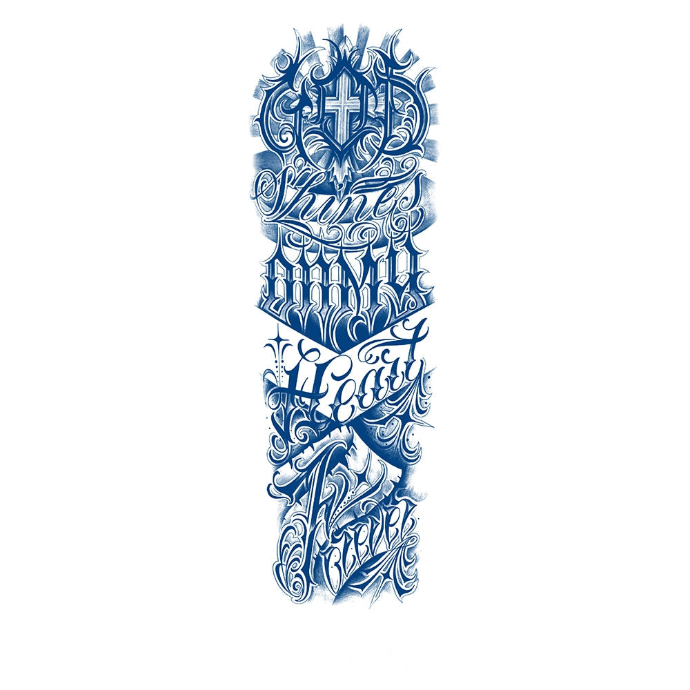 A striking calligraphic masterpiece combining bold lettering, intricate strokes, and sacred symbolism. With a cross crowned at the top and flowing script beneath, this tattoo embodies devotion, strength, and unwavering belief.