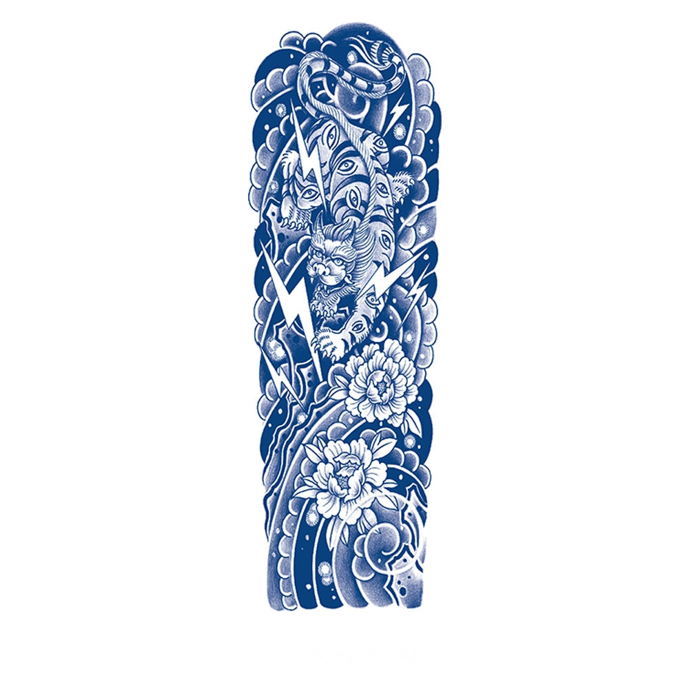 A fierce guardian spirit emerges amid crashing thunderbolts, surrounded by blooming flowers and swirling clouds. This design symbolizes unshakable courage, divine protection, and the relentless energy of nature’s raw force.