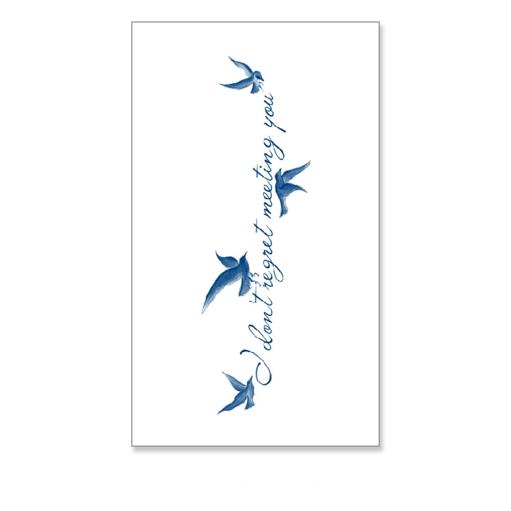Graceful birds soar around the heartfelt phrase “I don’t regret meeting you”, symbolizing cherished encounters, destiny, and memories that take flight forever.