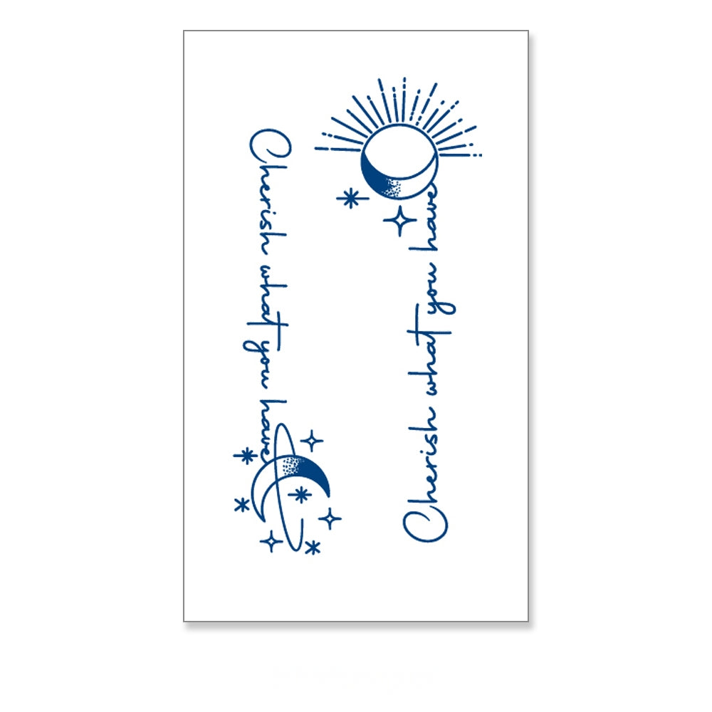 Flowing script with celestial designs — moon, stars, and radiant lines — spelling Cherish what you have, a reminder to find joy in the present and value life’s blessings.