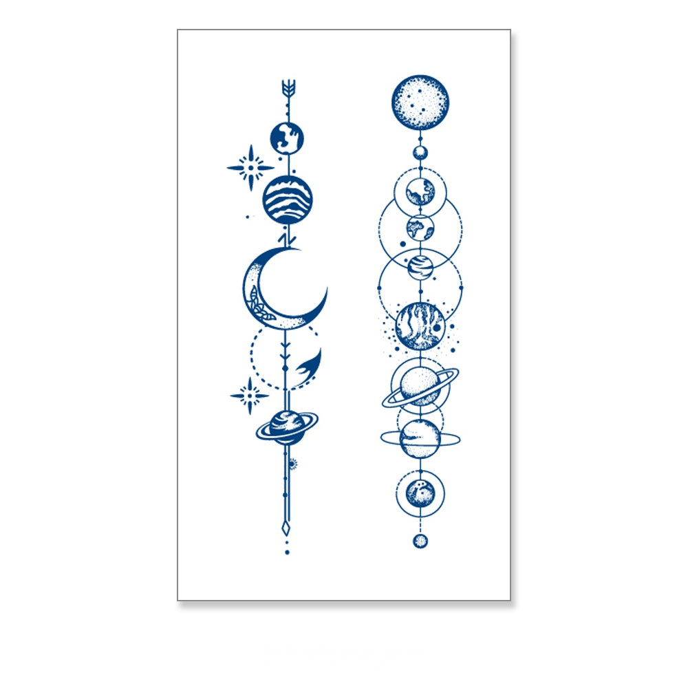 A celestial design of moons, planets, and stars aligned in harmony — symbolizing exploration, infinity, and the mystery of the cosmos.