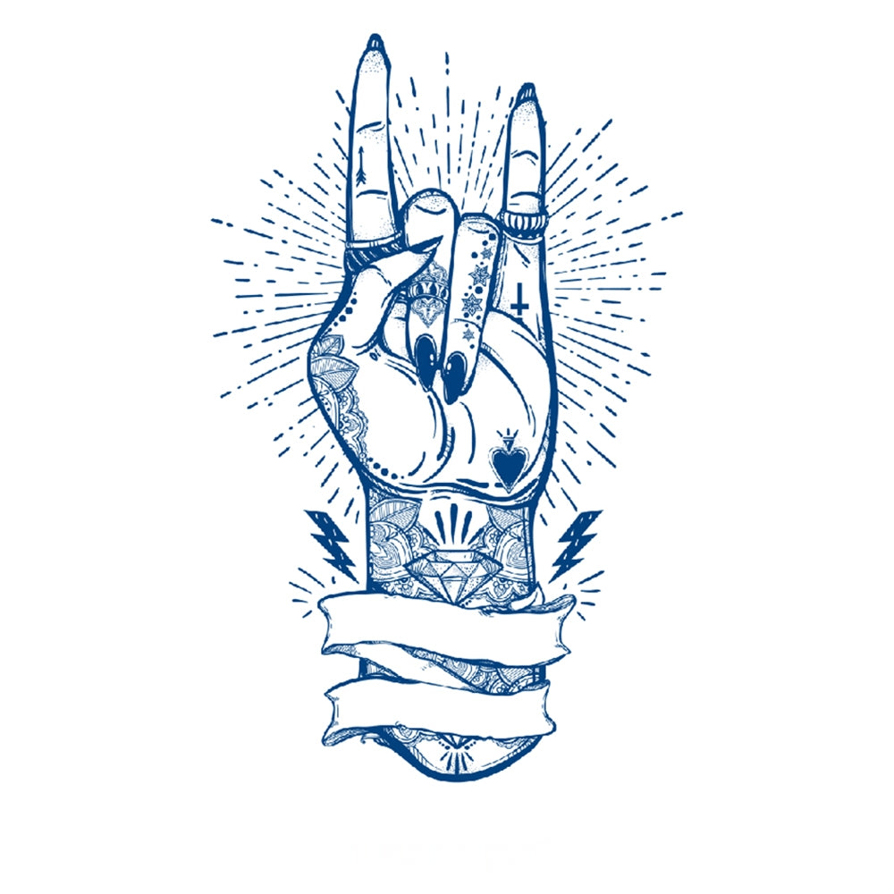 A sacred hand sign adorned with radiant patterns, lightning bolts, and cosmic details—capturing the timeless spirit of music, rebellion, and inner power.