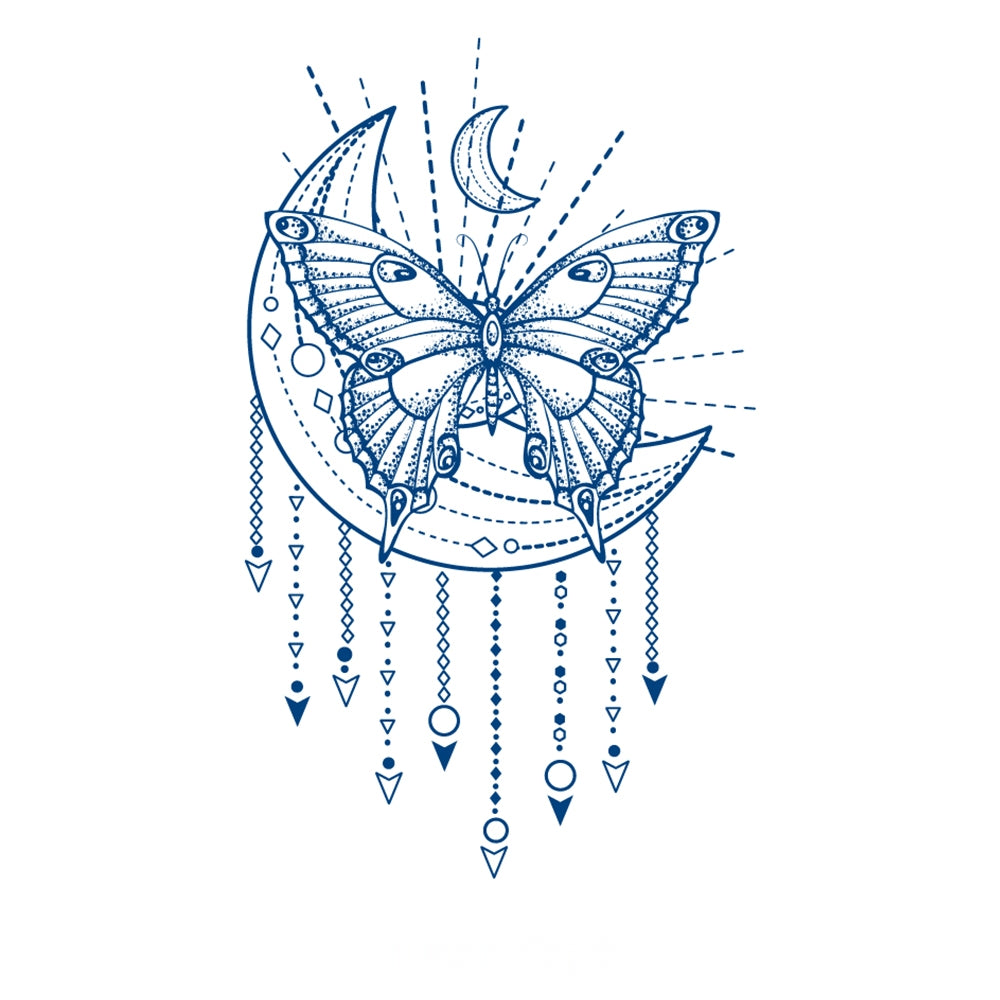 A delicate butterfly resting on a crescent moon, adorned with hanging ornaments—symbolizing change, dreams, and the magic of the night.
