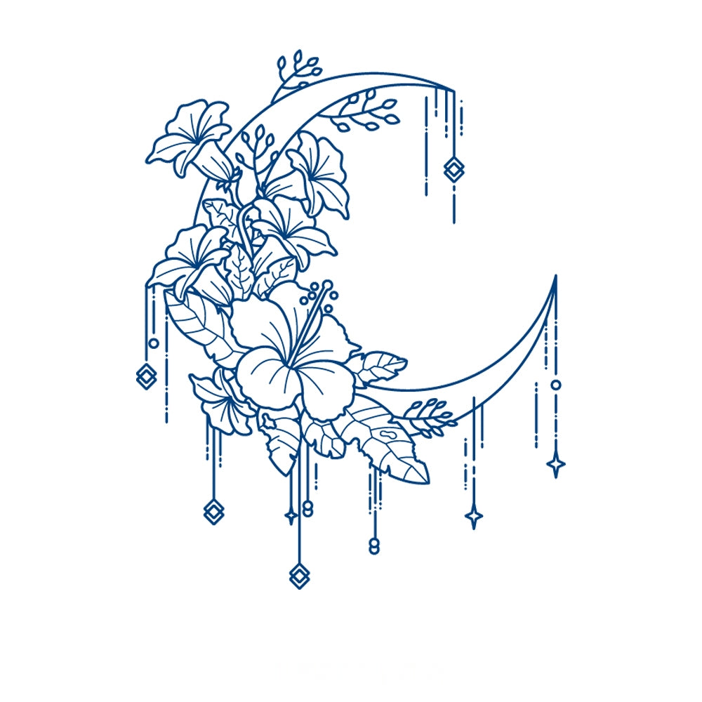 A crescent moon adorned with blooming flowers and hanging ornaments—symbolizing harmony, elegance, and the gentle glow of dreams.