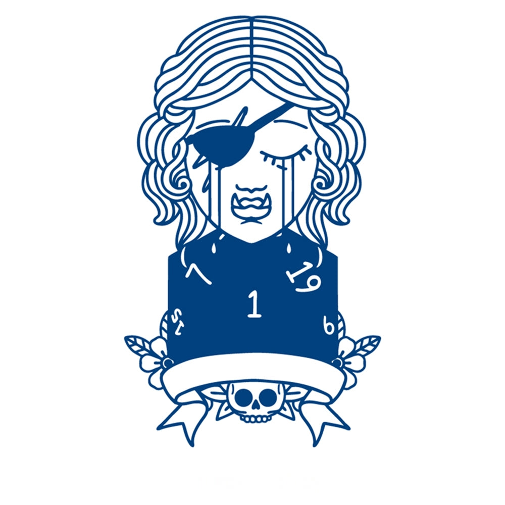 A crying pirate woman with an eyepatch weeps over a numbered die, crowned with a skull—symbolizing chance, loss, and the gamble of life’s trials.