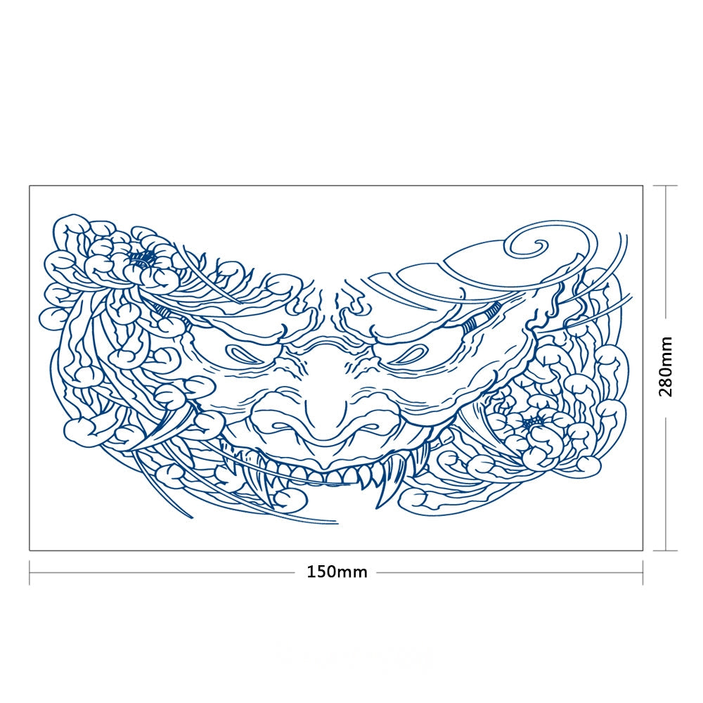 A fierce demonic mask emerges from swirling clouds and blossoms, symbolizing raw power, inner battles, and the triumph of resilience over turmoil—an emblem of transformation and unshakable will.