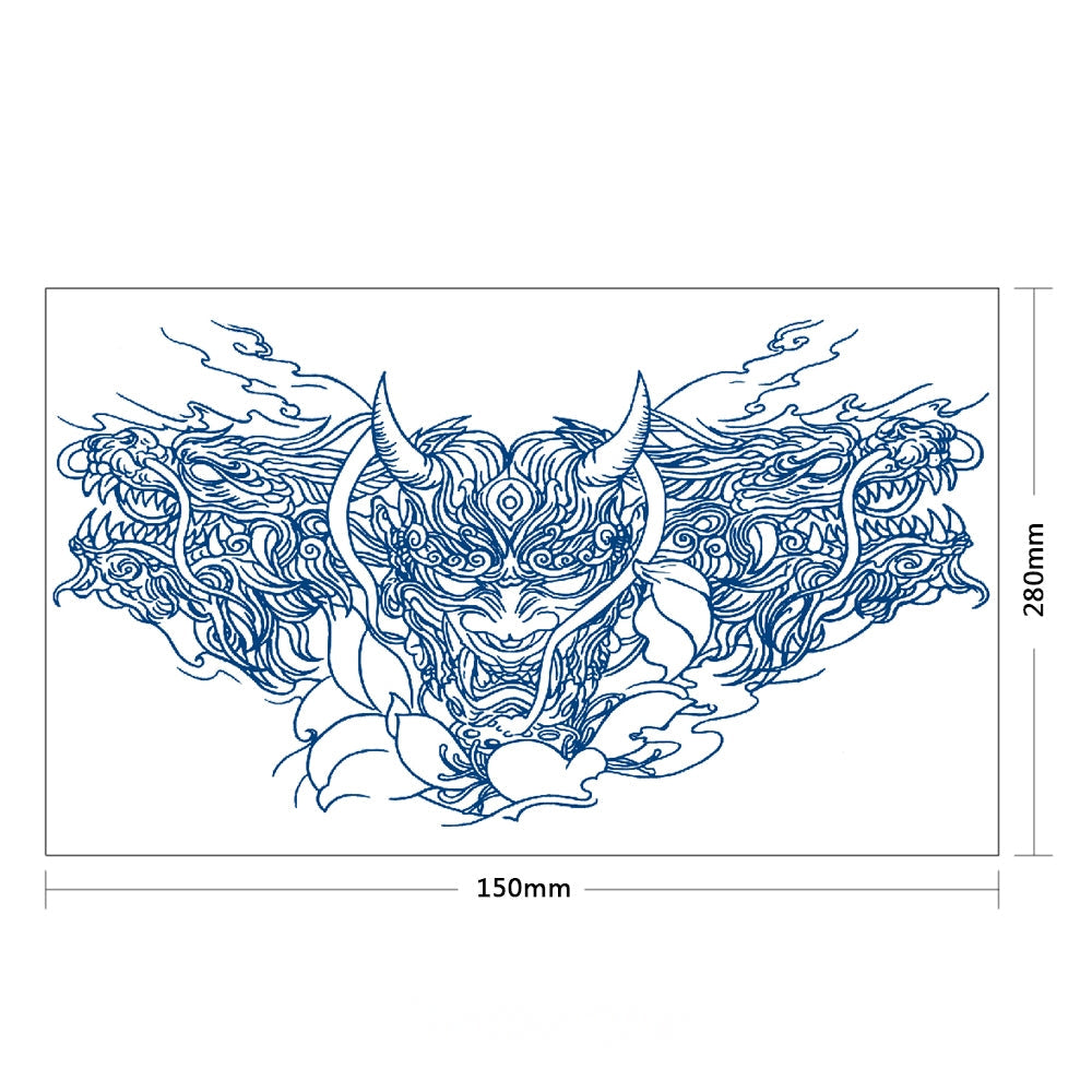 A fearsome oni mask flanked by two dragon-like serpents, representing inner battles between light and darkness, strength and vulnerability, destruction and rebirth.