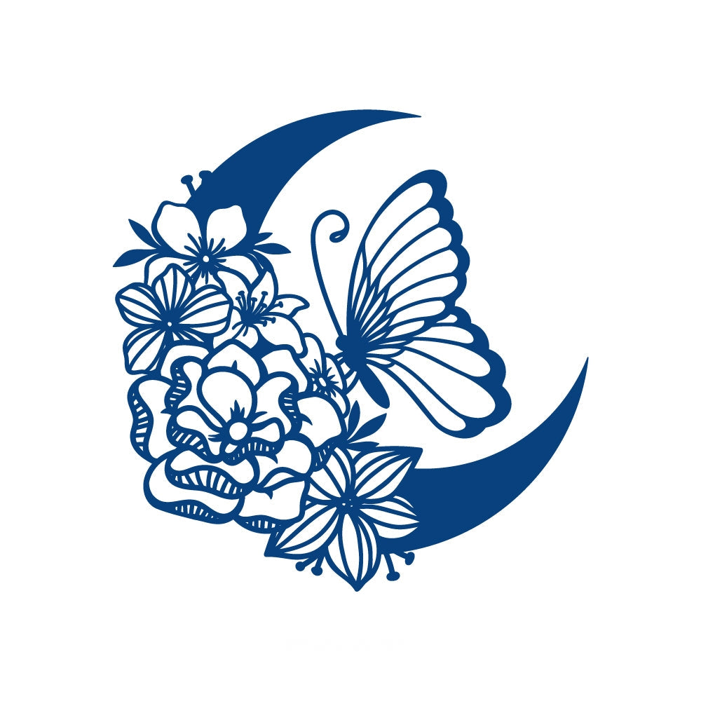 A butterfly rests on a crescent moon surrounded by blooming flowers — symbolizing rebirth, growth, and the harmony between nature and the cosmos.