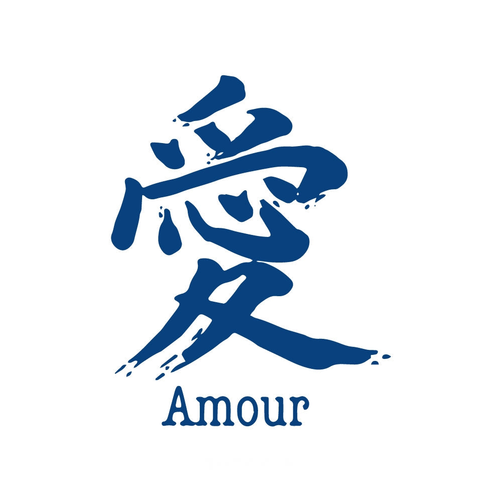 The Chinese character for love paired with the French word 'Amour' — a universal emblem of affection and connection across cultures.